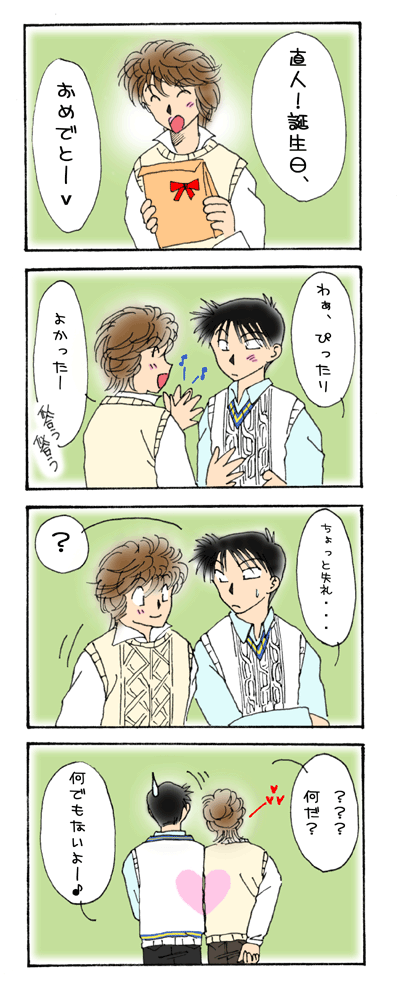 まさかタイムでマンガ描く日がこようとは 夢にも思っていませんでした! しかも何だろうこの 「やってしまった」感!(笑) 元ネタは言わずもがな ハヤ〇モ〇ミチくんでおなじみのアノCMですが 男同士でやるには寒すぎましたね! ああもう色々と反省!!